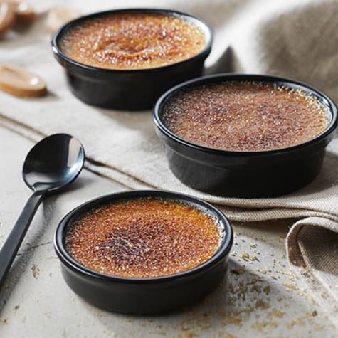 100 g der Masse in die Formen gießen. Sofort im Ofen bei 120 °C etwa 28 Minuten backen, das Backblech nach der Hälfte umdrehen. Vor dem Servieren mit braunem Zucker bestreuen und mit einem Brenner karamellisieren. Für die Crème Brûlée DULCEY 35% neben dem braunen Zucker ein wenig Fleur de Sel hinzufügen.