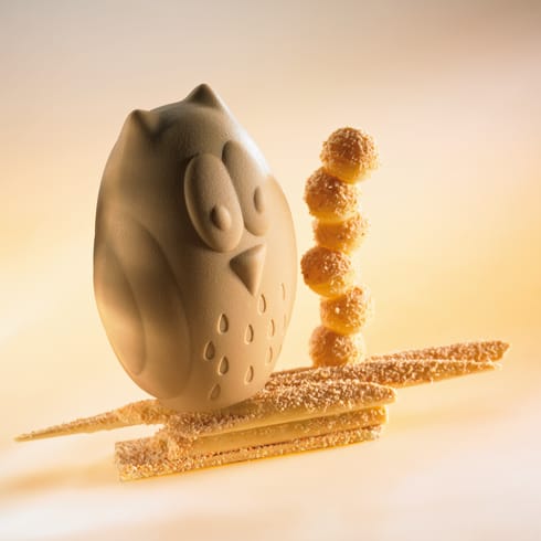 Mit temperierter blonder Schokolade Dulcey 32 % die Eulen, Artikelnr. 9795, formen. Wenden, die Kuvertüre kurz ablaufen lassen, egalisieren, dann kristallisieren lassen. Säubern. Bevor die Schokolade gänzlich kristallisiert ist, ein zweites Mal formen (optionaler Schritt oder mehr oder weniger abklopfen, je nach der gewünschten Dicke). Kristallisieren lassen, erneut säubern und einige Minuten in den Kühlschrank stellen oder bei 17°C kristallisieren lassen, bis sie sich von selbst aus der Form nehmen lässt. Anschließend die Eulenhälften aufeinander kleben, indem die Ränder der Hälften auf einer heißen Platte (zwischen 58 und 60°C) geschmolzen werden, um eine feste Schweißnaht zu erhalten. Bei 17°C kristallisieren lassen.
