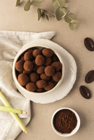 Use a piping bag (or spoon) to form the ganache into balls. Sift on the cocoa powder then roll the lemongrass-infused ganache balls in it. Place the cocoa-dusted balls in the sieve to remove any excess powder. Store in a cool place until fully hardened. To create a different texture, you can first coat the ganache balls with a tempered couverture chocolate and then place them in the sifted cocoa powder.