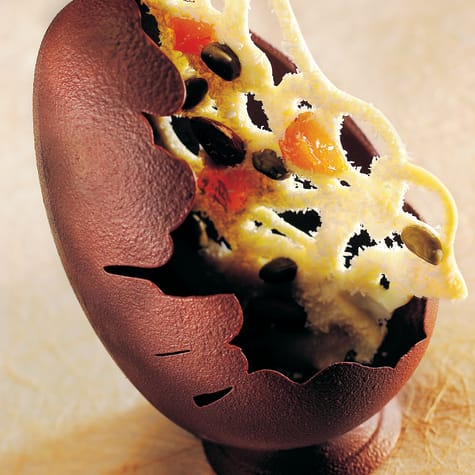 Mold a first layer on part of the half eggs with tempered dark chocolate couverture. Turn over for a few moments to allow the excess of couverture to run out, smooth off then leave to crystallize. Remove any rough edges. Before the chocolate is completely crystallized, it is possible to add another layer of couverture (this stage is optional, or you can tap the mold to spread the chocolate evenly and make the thickness of chocolate required). Leave to crystallize, remove any rough edges again and refrigerate for few minutes or leave at room temperature (16-18°C) until the mold detaches itself. To mold the second part of the eggs, you need to make wave patterns with the chocolate couverture by following these tips... Tip from our pastry chef to open one side of your mold: To open one side of the egg: - cut out the required portion using a cocktail stick - or pipe irregular waves of chocolate from the base of the half mold, paying attention to leave a part of the side open. Once the contour is finished and before it crystallizes completely, add a second layer to reinforce the first half egg.