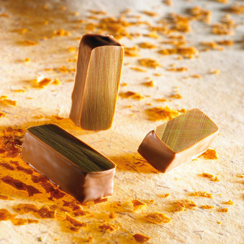 Once the yuzu ganache is made, stack a 4 mm high confectionery frame on top of the first one and pour the ganache at 32°C over the crunchy praliné. Allow to crystallise for 24 to 36 hours at 17°C and 60% hygrometry. Pre-coat the ganache slab with tempered milk couverture and cut into rectangles of 36x15 mm using a confectionery guitar. Using a wire brush, scratch the surface of plastic sheets to create a scrubbed finish effect. Apply sparkling green powder on the plastic sheets with a paint brush to accentuate the décor's striation. Coat the ganache & praliné fillings with tempered milk chocolate and lay down a décor plastic sheet on the chocolate bonbons. Allow to crystallise at 17°C before removing the décor plastic sheet.