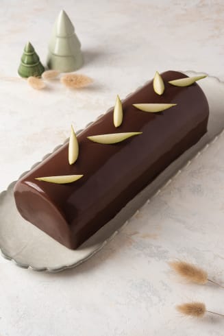 Remove the f rozen Yule log f rom the mould. Transfer the GUANAJA 70% glaze into a jug and evenly distribute it over the log positioned on a rack.