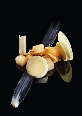 Sprinkle the vanilla powder onto an acetate sheet. Pour some tempered Opalys chocolate on top and add another acetate sheet. Roll out the chocolate. Before it sets completely, cut out three circles in varying sizes using a pastry cutter. Leave to set. Whip the Opalys Vanilla Ganache until smooth. Use a piping bag with a plain n°11 nozzle to pipe balls of ganache onto the chocolate discs and then place another chocolate disc on top. Set aside in the fridge. Drain the pear cubes using absorbent paper. Use a paintbrush to paint a smear of unwhipped ganache across the base of the dish and then arrange 15 g of Pear Confit on top. Cover with around 20 g of streuzel. Finish the dessert by arranging a few pear cubes and the chocolate discs garnished with whipped Opalys Vanilla Ganache. Serve immediately.
