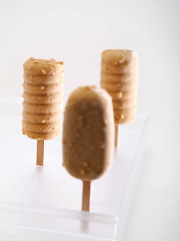 Use a small palette knife to coat the ice-cream bar molds with 10 g of Tropical Iced Mousse and place in the freezer. Churn the ice-cream. When churned, marble the ice-cream with 500 g of Tropical Iced Mousse. Fill the molds, insert the ice-cream sticks and blast freeze. Heat the coating mixture to 40 °C (104 °F) and mix with the crushed Breton Shortbread. Unmold the ice-cream bars and tip in the mixture at 35 °C (95 °F). Store at -18 °C (-0.4 °F). Serve at between -12 °C and -14 °C (7–10 °F). TIP: The Dulcey Ice-Cream can also be served in 500 ml pots
