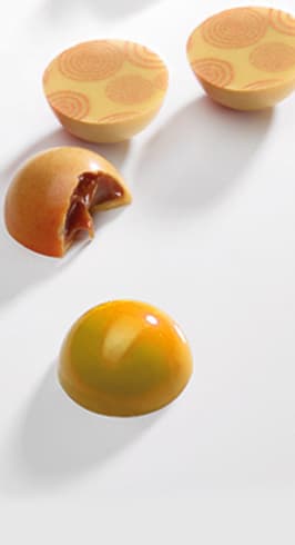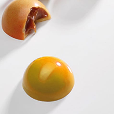 Use a spray gun and spray gun mixture which you have pre-set at 85°F (30°C). Partially spray the half-sphere molds. Scrape off any excess and leave to set. Then use as a mold for the PASSION FRUIT INSPIRATION. Turn out and leave to spread for a few moments, then smooth away any excess. Drain the molds by holding them suspended over two rulers. Before they set completely, trim any excess off the half-spheres. Leave to set. Use a piping bag to fill the half-spheres with ganache. Make sure that the temperature of the ganache is below 80°F (28°C). Leave to set for 24 hours at 60°F (17°C) and a 60% relative humidity level. To seal the chocolate bonbons, use a heat gun to soften the edges of the half-spheres, then close off the hole with tempered BAHIBÉ. This way, the joints will be seamless.Tip: For chocolate bonbons with totally smooth bases, apply a fine layer of tempered PASSION FRUIT INSPIRATION then immediately cover with acetate paper