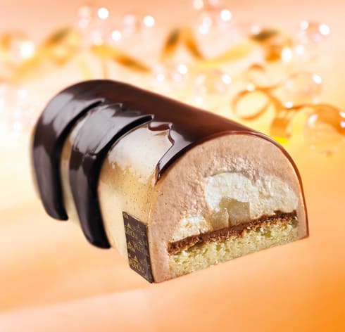 Unmold the yule logs and spray with the hot Gold Vanilla Absolu Cristal Glaze. Freeze.