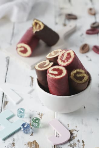Using a toothpick, immerse each Swiss roll in the different coatings. Once the Swiss rolls are completely