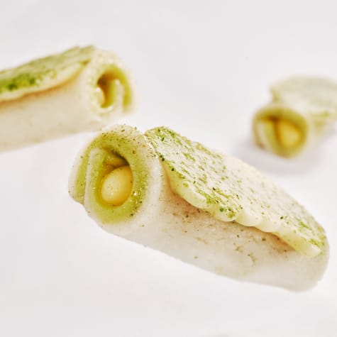 Laminar entre dos hojas de guitarra a 2mm mazapán neutro 33% VALRHONA. Hacer la misma operación con el mazapán de albahaca. Colocar uno encima del otro y laminar los dos a 2mm. Cortar piezas de 5x4cm rellenar con la crema de limón y enrollar. Dejar secar una noche a temperatura ambiente y al día siguiente, colocar un zig zag de cobertura Opalys sobre una hoja de guitarra con albahaca liofilizada en polvo y antes de que seque aplicar el hueso de santo. Dejar cristalizar la cobertura unos minutos, y despegar los huesos de santo albahaca-limón de las hojas de guitarra.