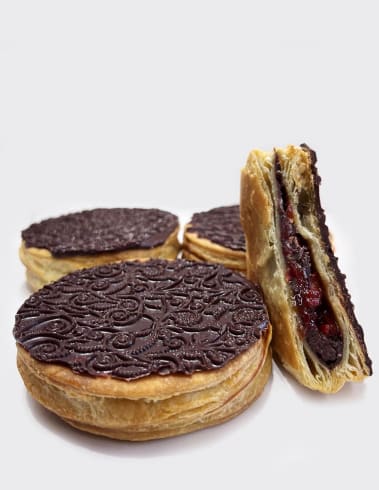 (41 g aproximadamente por aro) y cubrir con nata, después cerrar con otro disco de pasta. Hornear a 170 °C durante 30 minutos en la parte superior del horno con calor envolvente sobre una placa cubierta con papel de horno. Terminar cubriendo la parte superior con chocolate templado atemperado. Poner la hoja de relieve, dejar enfriar y retirar la hoja.