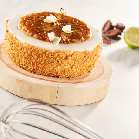 Desmoldar, después colocar un disco de compota sobre cada tarta. Pulverizar seguidamente con el glaseado neutro y cubrir los bordes de la tarta con coco rallado tostado. Decorar con virutas de coco fresco.