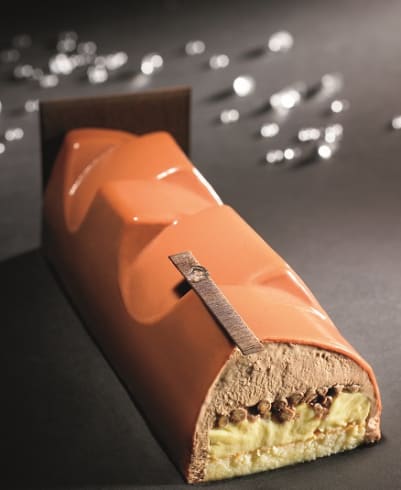 En la placa de bizcocho, cortar 5 tiras de 7 x 54 cm.Con ayuda de una manga con boquilla St Honoré, escudillar por cada tira de bizcocho, 760 g de cremoso Ivoire Kalamansi enforma de ola y cubrir el interior con unos 300 g de perlas crujientes Caramélia.Congelar el conjunto. Una vez congelado, disponer el interior sobre rejilla después con ayudadel gel Kalamansi glasear el interior. Congelar de nuevo el conjunto.Realizar la mousse ligera, después colar 1000 g en cada molde de tronco.Insertar las tiras bizcocho +cremoso congelados teniendo cuidado de poner el bizcocho a la misma altura que el borde del molde. Congelar.Desmoldar los troncos y pulverizarlos con ayuda del glaseadocaliente Absolu Cristal chocolate con leche.Para terminar la decoración de los troncos, atemperar chocolate negro, pegar con ayuda de un poco de aceite hojas de guitarrasobre placas muy planas.Verter una cantidad de cobertura y cubrir seguidamente con una segunda hoja guitarra, después con un rodillo de pastelería, extender y alisar lacobertura hacia el exterior.Verificar el espesor. Cuando la cobertura empiece a cristalizar, cortar con una bicicleta cuadrados enteros que servirán de conteras.Dejar cristalizarunas horas antes de despegar las formas. Colocar las conteras en los extremos de los troncos. Colocar un logo de la casa.