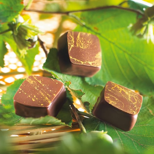 Pré-enrober la ganache de couverture Lactée puis découper à la guitare des carrés de 22,5 mm.Réaliser une solution de poudre or et d’alcool ni trop fluide ni trop épaisse.A l’aide d’un pinceau, parsemer les feuilles guitare de solution Or puis réaliser un effet vague avec les doigts (utiliser des gants).Laisser sécher la solution, puis au moment de l’enrobage, déposer une feuille transfert sur les bonbons.Laisser cristalliser complètement à 16°C, avant d’ôter la feuille guitare.