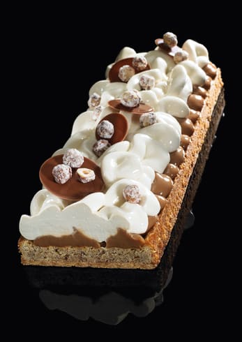A l’aide d’une poche sans douille, dresser environ 700 g de crème de noisette. Cuire à 180°C. Après refroidissement, décadrer et à l’aide d’une poche munie d’une douille de 10 mm, dresser environ 700 g de crémeux Praliné sur la tarte en formant des gouttes. Foisonner la ganache montée Opalys café, et à l’aide d’une poche muni d’une douille Saint-honoré, dresser environ 400 g par bande. Surgeler le tout. A l’aide du nappage Absolu cristal chaud, pulvériser les bandes de tarte. Pour terminer le décor des tartes, tempérer de la couverture lactée, coller à l’aide d’un peu d’huile des feuilles guitares sur plaques bien plates. Verser une petite quantité de couverture et recouvrir aussitôt d’une seconde feuille guitare puis à l’aide d’un rouleau à pâtisserie, étaler et lisser la couverture en la chassant vers l’extérieur. Vérifier l’épaisseur et détailler des disques de différents diamètres. Laisser cristalliser à 17°C. Après cristallisation décoller les décors des feuilles guitares et avec de la couverture fondue coller quelques noisettes sablées sucrées/salées. Décorer la tarte avec les décors chocolat et quelques noisettes sablées sucrées/salées.