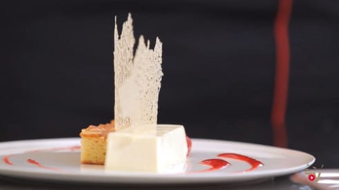 Découper des rectangles de Pain de gènes chocolat de 10x3,5 cm. Dans une assiette déposer a l’aide d’une poche et d’une douille rectangle, une bande de crème Namelaka. Accompagner avec une bande de Pain de gènes et intercaler avec deux éclats d’opaline. Ajouter quelques framboises semi confites et d’un trait de sauce framboise.