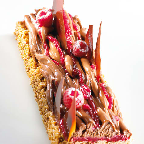 Réaliser le sablé pressé feuilleté et à l’aide d’une cuillère en parsemer aussitôt 650 g par cadre de 60 x10 cm puis le presser de façon régulière. Décadrer et réserver au réfrigérateur. A l’aide d’une poche sans douille, dresser environ 180 g de compotée framboise sur le sablé. A l’aide d’une poche munie d’une douille de 10 mm dresser environ 300 g de crémeux chocolat sur la compotée, de manière irrégulière dans le sens de la longueur. Pour le décor, dresser irrégulièrement environ 20 g de compotée sur le crémeux. Surgeler le tout. A l’aide du nappage Absolu Cristal chaud, pulvériser les bandes de tarte. Pour terminer le décor des tartes, tempérer de la couverture noire, coller à l’aide d’un peu d’huile des feuilles guitares sur des plaques bien plates. Verser une petite quantité de couverture et recouvrir aussitôt d’une seconde feuille guitare puis à l’aide d’un rouleau à pâtisserie, étaler et lisser la couverture en la chassant vers l’extérieur. Vérifier l’épaisseur. Laisser cristalliser à 17°C. Disposer quelques framboises sur la tarte (voir photo) ainsi que quelques éclats de couverture noire. Déposer un logo maison.