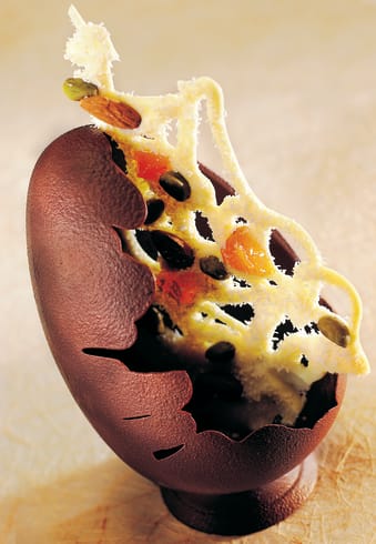 Préparer un assortiment de fruits secs : - amandes et noisettes entières torréfiées, - pistaches vertes décortiquées, - noix de coco en poudre, - morceaux d’abricot semi-confits, etc. Tempérer de la couverture lactée et ivoire. Sur une feuille de papier sulfurisé, appliquer les oeufs pour dessiner leurs contours, puis appliquer une feuille plastique transparente. A l’aide d’une poche légèrement ouverte, réaliser des coulures de couverture lactée ou ivoire de forme circulaire se chevauchant en respectant approximativement la grosseur des oeufs et l’ouverture réalisée dans les moules; cela pour faciliter le montage. Puis, avant cristallisation de la couverture, parsemer la surface des fruits secs en terminant par la noix de coco. Laisser partiellement cristalliser, puis découper des barres d’environ 2.5 à 3 cm de large. La hauteur dépendra des moules à oeufs choisis.