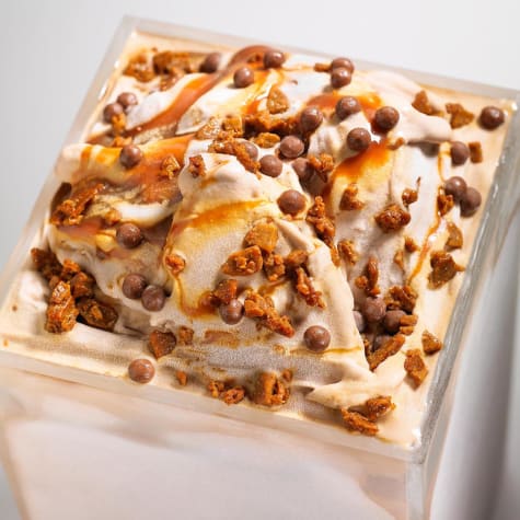 Lorsque que la glace est turbinée, dans une bassine et à l’aide d’une maryse, marbrer la glace avec la sauce caramel, des éclats de Toffee et des perles craquantes Caramélia. Mouler ou éventuellement couler en bac.