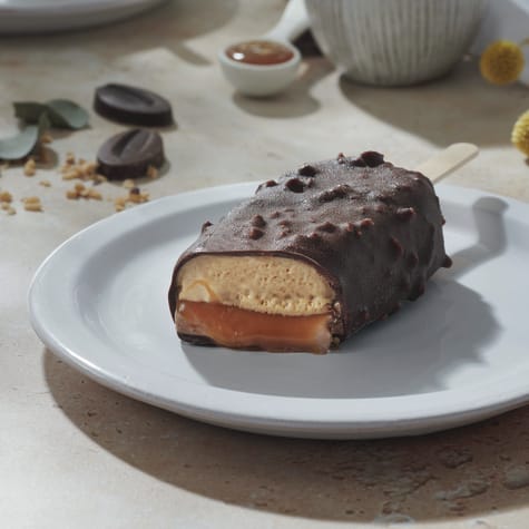 Réaliser la mousse glacée praliné et couler 30 g dans chaque empreinte de moule. Placer le moule au congélateur pendant 3 heures. Insérer les bâtons à glace dans chaque moule et pocher 15 g de sauce caramel sur la mousse glacée praliné. Placer à nouveau 3 heures au congélateur. Mixer et turbiner la glace au lait et chocolat GUANAJA 70%. Pocher 40 g dans chaque moule sur le caramel et lisser avec une petite palette coudée. Remettre au congélateur 3 heures avant de pouvoir les enrober avec le glaçage esquimau. Recongeler pour que la glace prenne. Déguster !