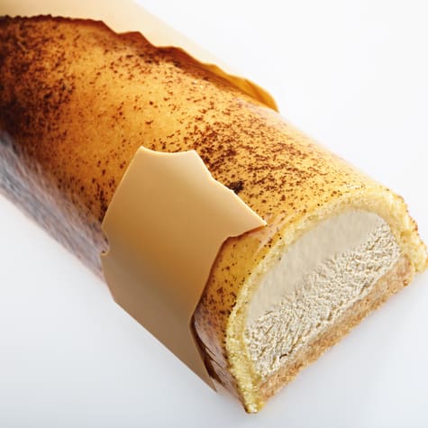 Réaliser le sablé breton pressé et à l’aide d’une spatule, étaler aussitôt 2000 g par cadre de 60 x 40 cm puis le presser de façon régulière. Décadrer et laisser cristalliser. Découper ensuite 5 bandes de 7x 52 cm. Etaler 600 g de compotée banane passion par plaque de biscuit viennois refroidi puis découper des bandes de 18 x 52 cm et réserver au congélateur. Glisser ensuite les bandes de biscuit et compotée dans les moules bûches grand U et à l’aide d’une poche munie d’une douille de 16 mm, dresser en forme de boules de façon irrégulière 500 g de crémeux Dulcey préalablement cristallisé. Surgeler le tout. Réaliser la mousse allégée Dulcey puis couler 650 g par moule à bûche. Insérer ensuite une bande de sablé breton pressé pour obturer le moule en prenant soin d’avoir le sablé pressé à la même hauteur que le bord du biscuit viennois. Surgeler l’ensemble. Démouler les bûches et les pulvériser à l’aide du nappage Absolu banane passion. Tempérer du chocolat Dulcey puis mouler finement 2 moules à bûches grand U puis laisser cristalliser. Démouler ensuite les moulages et casser grossièrement. Décorer avec les éclats (voir photo) et un logo maison.