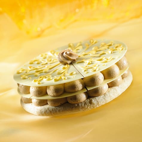 Veiller à coller et superposer correctement chaque portion de fines feuilles chocolat pour obtenir une belle coupe de cet entremet. Astuce du pâtissier : Afin de protéger le biscuit meringue de l’humidité de la crème, vous pouvez placer un disque de fines feuilles de chocolat directement sur le biscuit et ensuite procéder au même montage.