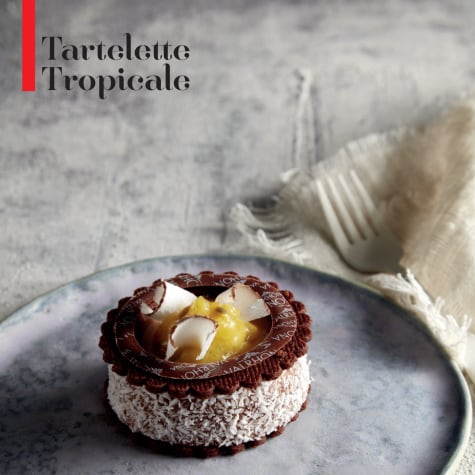 Remplir le trou du savarin avec le chutney (20 g). Décorer avec des copeaux de noix de coco fraîche et la pulpe de fruit de la passion.