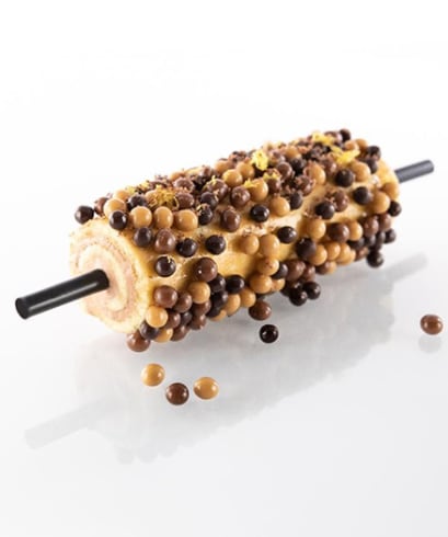 Découper des rectangles de 11 cm x 12 cm puis rouler autour d'un bâton de façon à ce que celui-ci dépasse de quelques centimètres de chaque côté. Surgeler.A l'aide d'un pinceau, appliquer une fine couche d'Absolu Cristal sur le biscuit puis rouler dans un mélange de perles craquantes.