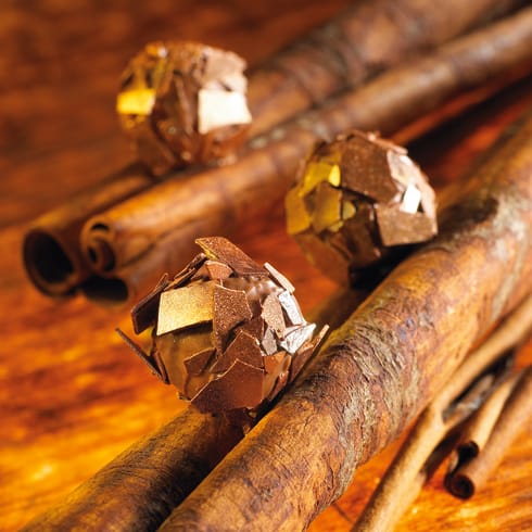 Mélanger le praliné et la couverture préalablement fondue à 45/50°C. Tempérer la masse à 24°C. Ajouter l’Eclat d’Or concassé et tamisé (pour éliminer la poudre) et les éclats de caramel à la cannelle. Garnir les boules creuses lactées et laisser cristalliser 12 heures à 17°C et 60% d’hygrométrie. Obturer les boules creuses de couverture lactée. Etaler finement à l’aide d’un rouleau de la couverture noire tempérée entre deux feuilles guitare. Laisser cristalliser. Froisser les feuilles guitares afin d’obtenir des brisures de chocolat. Les colorer avec de la poudre de bronze dilué dans de l’alcool. Déposer les boules garnies dans une bassine, se munir d’une paire de gants et verser dessus un peu d’enrobage lacté praliné tempéré. Remuer de manière à enrober les boules, puis les verser sur une feuille de papier sulfurisée parsemée de brisures de chocolat colorées en bronze et les rouler partiellement. Laisser cristalliser.