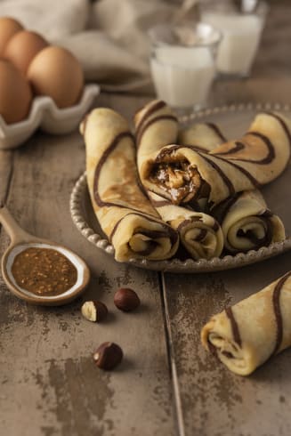 Séparer la pâte en ¹/³ et ²/³. Dans le premier tiers, ajouter le praliné et le chocolat CARAÏBE 66% préalablement fondu. Laisser reposer les pâtes plusieurs heures au réfrigérateur. Verser ensuite la pâte colorée dans une pipette. Faire chauffer une poêle avec une noisette de beurre. Lorsque la poêle est bien chaude, verser la pâte colorée dans la poêle en formant un tourbillon. Au bout de quelques instants, verser une louche de pâte à crêpe nature sur le tourbillon. La crêpe ainsi formée occupera toute la