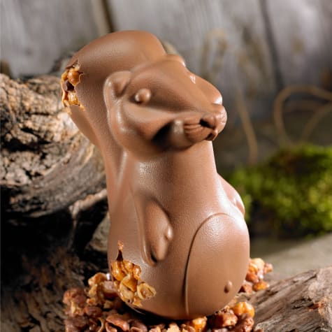 A l’aide d’une plaque chauffante fondre le dessous de l’écureuil puis le coller aussitôt sur la base de noisettes caramélisées. Tempérer le mélange appareil à pistolet lait et pulvériser délicatement les écureuils en prenant soin de ne pas trop recouvrir les noisettes apparentes.
