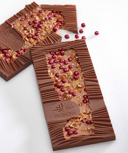 Réaliser le praliné amande et couler 500 g par cadre 34 x 34 cm sur une feuille guitare préalablement chablonnée de chocolat Jivara.